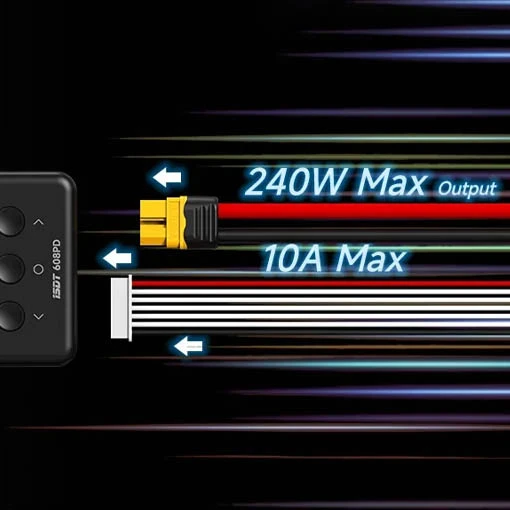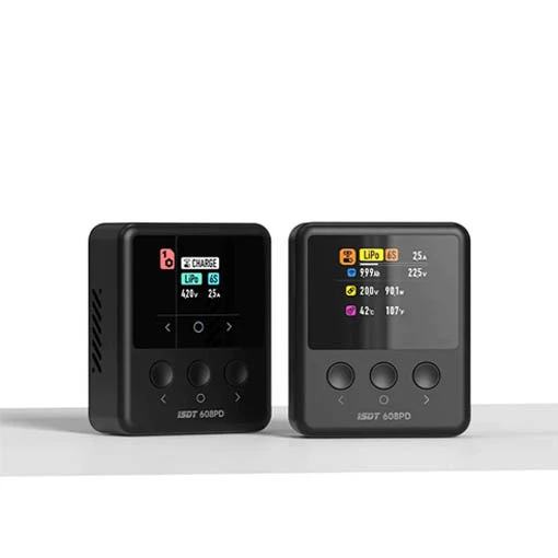 Le chargeur ISDT 608PD dispose d’une sortie pour charger et décharger vos batteries. Il est compatible avec les LiHv, LiFe, LiPo de 1 à 6S, les batteries de plomb de 1 à 12S et les NiMH de 1 à 16S. De dimensions de 72,5 x 60 x 26,6 mm avec un poids de seulement de 85 g, ce chargeur ISDT possède une entrée de source de 5 à 30 V et une puissance de charge maximale de 240W (DC). Grâce à son connecteur USB-C intégré, vous pourrez charger à tout moment vos batteries, même en déplacement.