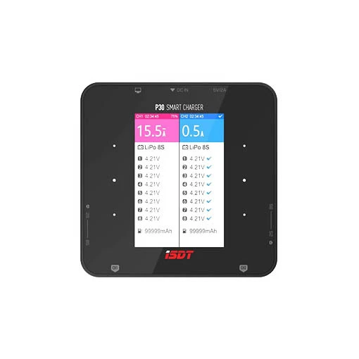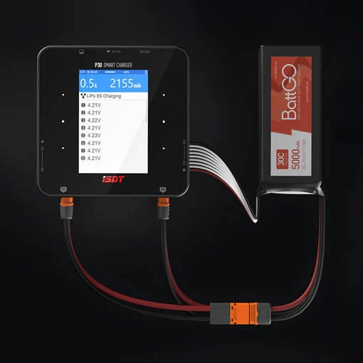 Le chargeur ISDT P30 comprend deux sorties pour charger et décharger simultanément 2 batteries. Il prend en charge les LiPo, Li-ion, LiFe de 1 à 8S, les LiHV de 1 à 7S, les batteries au plomb de 1 à 12S et les NiMH et NiCd de 1 à 16S. Ce chargeur ISDT est aussi compatible avec les batteries intelligentes BATTGO. De dimensions de 110 x 110 x 65 mm avec un poids de 730 g, ce chargeur possède une entrée de source de 10 à 34 V (DC). Sa puissance de charge peut atteindre jusqu’à 1 000 W pour chaque prise et jusqu’à 1 500 W en charge parallèle.