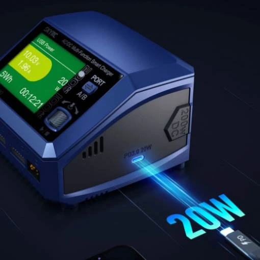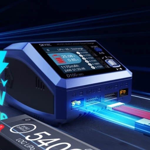 Le chargeur SkyRC D100 est doté d’une double entrée AC/DC, de deux sorties XT60 avec prises d’équilibrage et d’un écran rétroéclairé de 2,8 pouces. De dimensions de 116 x 110 x 79 mm avec un poids de seulement 470 g, ce chargeur léger pourra vous suivre lors de vos déplacements et de vos sessions de vol. Vous pourrez charger jusqu’à 2 batteries simultanément. Ce chargeur SkyRC est d’ailleurs compatible avec les LiPo, LiFe, Li-ion, LiHV de 1 à 6S, NiMH, NiCd de 1 à 15S, ainsi que les batteries au plomb de 3S, 6S et 12S.