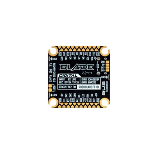 Le contrôleur de vol RUSHFPV Blade Digital V2 est parfait pour les sets up FPV avec émetteur numérique. Il dispose d’un processeur STM32F722RET6, d’un gyroscope ICM42688P, d’un baromètre BMP280, d’une Blackbox de 16 Mb et d’un double BEC (5V 3A et 10V 3A). Cette carte de vol RUSHFPV comprend aussi 5 UARTS, 8 ports PWM, 2 ports ADC et un port I2C.