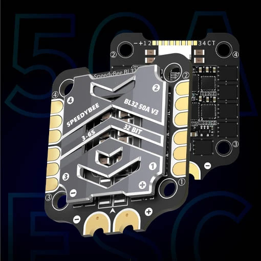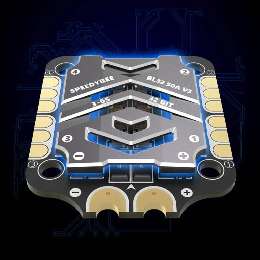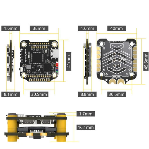 Le contrôleur de vol SpeedyBee F722 V3 possède un processeur STM32F722, d’un gyroscope BMI270 et d’une Blackbox de 500 MB et de 5 UARTS. Cette 3ème génération dispose aussi de deux BECs (9V/4A ; 5V/2A), d’un baromètre BMP280, d’un port USB-C. Grâce au Bluetooth intégré, vous pourrez également vous connecter à votre FC via l’application SpeedyBee et ainsi configurer votre carte de vol, effectuer les réglages sous Betaflight, EMUflight et INAV.