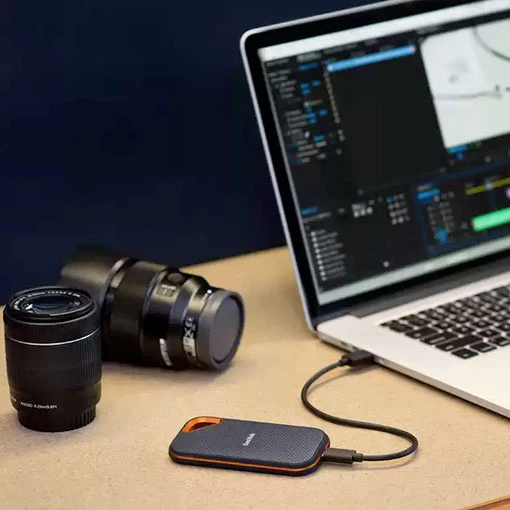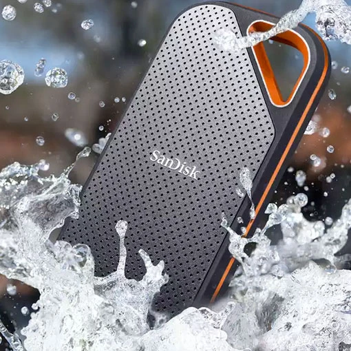 Offrant une vitesse d’écriture et de lecture jusqu’à 2000 Mo/s, le disque dur SSD portable SanDisk Extreme PRO® est doté d’une capacité de stockage au choix de 1, 2 ou 4 To. De quoi sauvegarder tous vos travaux photos, comme vidéos ! Léger et compact, ce disque dur SSD vous accompagnera partout : robuste, son boîtier en aluminium forgé fera office d’un excellent dissipateur thermique. Sa coque en silicone le protègera des chutes (jusqu’à 2 m), de l’eau et de la poussière (norme IP55).