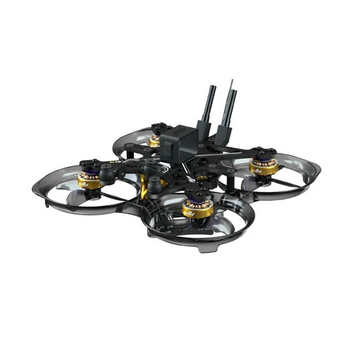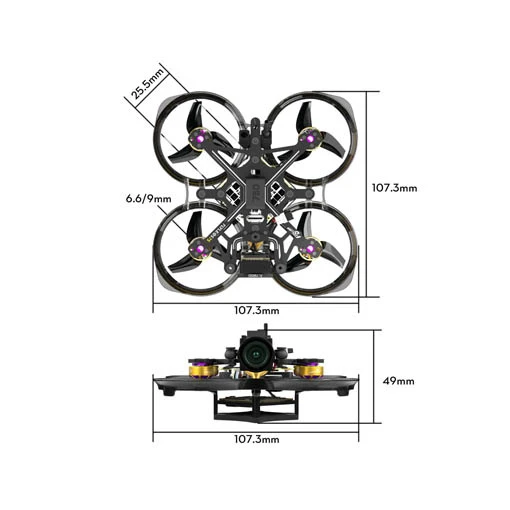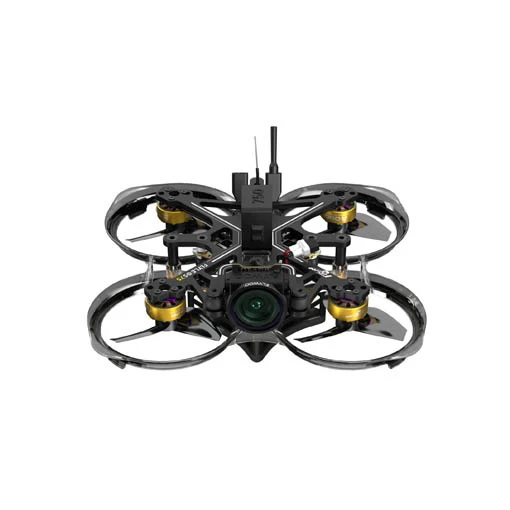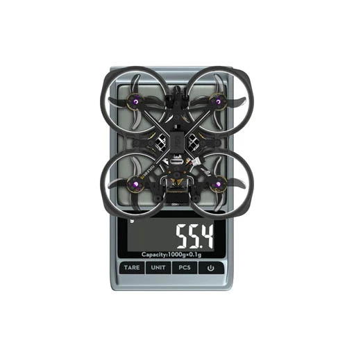 Le Flylens 75 comprend une carte de vol AIO GOKU F405 HD 2S ELRS V2, des moteurs type pusher ROBO 1003 de 14 800KV couplés à des hélices tripales 1611 (40 mm). Ses hélices à poussée inversée vous garantiront de plus une stabilité et une endurance accrue à votre machine. Ce cinewhoop dispose également d’une structure combinant fibre de carbone et PC pour une meilleure durabilité. Il est de plus fourni avec des supports pour batterie à dégagement rapide pour plus de confort d’utilisation. Vous pourrez l’alimenter avec une LiPo 2S (non fournie) via son connecteur XT30.
