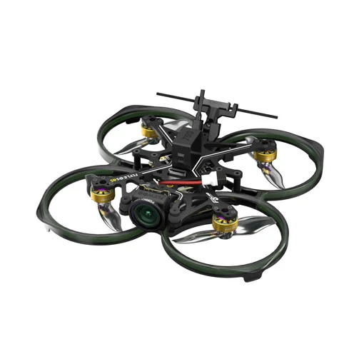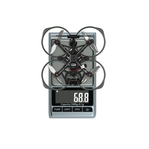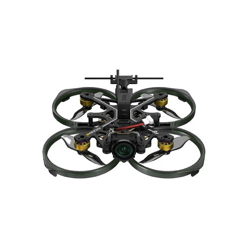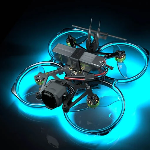 Ce drone dispose d’une AIO GOKU F405 HD 2S ELRS V2, de moteurs type pusher ROBO 1003 de 14 800Kv et des hélices bipales 2015. Ses hélices à poussée inversée permettent une meilleure stabilité et une plus grande autonomie. Ce cinewhoop possède une structure résistante en fibre de carbone. Il est aussi livré avec des supports TPU à dégagement rapide pour batterie. Sa protection d’hélices est de plus dotée de LED pour affirmer votre style et y voir plus clair dans les environnements sombres. Pour l’alimenter, utilisez une LiPo de 2S (non fournie) via son connecteur XT30UP.