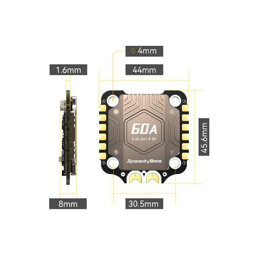 De dimensions de 45,6 x 44 x 8 mm avec un poids de 23,5 g, cet ESC SpeedyBee est doté d’une structure robuste composée de 3 couches de cuivre et d’un système de dissipation thermique CNC innovant pour de meilleures fiabilité et durabilité. Il comprend aussi une diode de protection TVS, un condensateur de filtrage SMD interne, ainsi qu’un condensateur 35V 1000uF externe pour plus de sécurité.