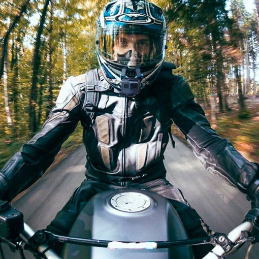 Cette fixation permet de capturer des images très immersives, pour des vidéos au rendu « tel que vous le voyez ». Le positionnement sur la mentonnière rend l’ensemble plus discret et réduit considérablement la prise au vent par rapport à une fixation sur le dessus ou le côté du casque.
