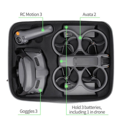 Cette housse vous permettra de stocker un drone DJI Avata 2, des DJI Goggles 3, un DJI RC Motion 3, trois batteries dont une dans le drone, des filtres, câbles et autres petits accessoires essentiels.