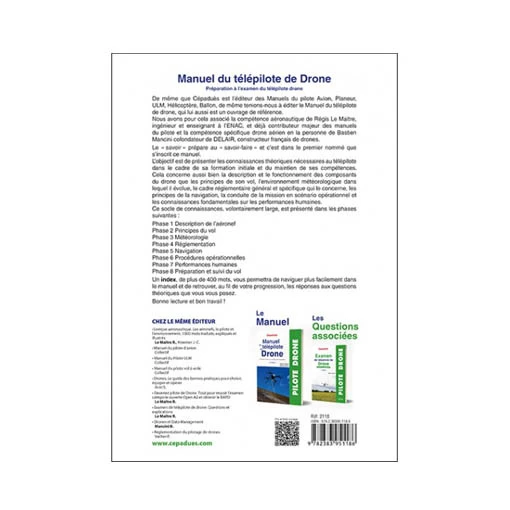 L’ingénieur et enseignant ENAC, Régis Le Maître et le co-fondateur de DELAIR, Bastien Mancini, fournissent une expertise complémentaire dans cet ouvrage. Ce manuel Cépaduès est un ouvrage indispensable pour tout télépilote. Il vous permettra également de connaitre plus en détails la législation actuelle, des procédures opérationnelles et des préparations avant et après vol.