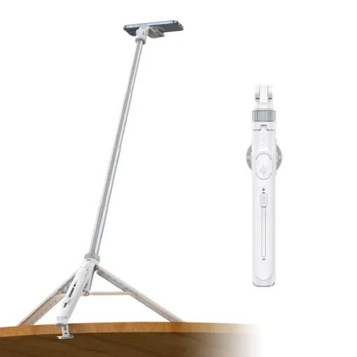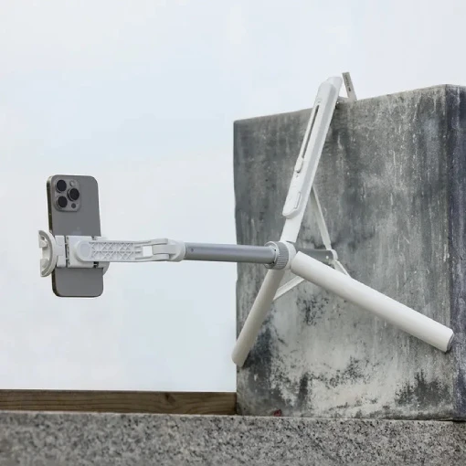 La perche est dotée d’une pince pour maintenir fermement votre téléphone, ainsi que d’un panneau magnétique MagSafe pour plus de sécurité. Cette pince est accrochée à une rotule qui permet une rotation à 360° pour des prises de vue horizontales comme verticales. Elle est équipée de fixation Cold Shoe afin de pouvoir ajouter une lampe ou un microphone. Le pied de la perche T111 est facilement déployable. Il intègre un crochet utile pour sécuriser l’accessoire au support sur lequel il est posé.