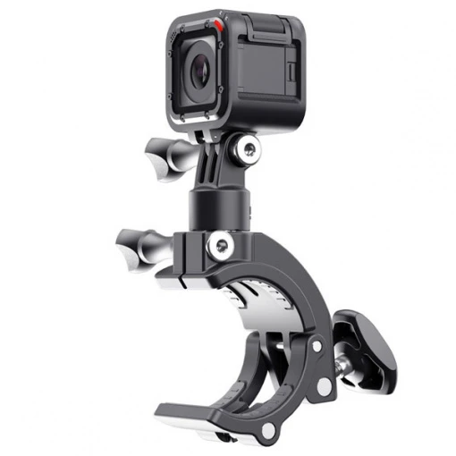 Cette fixation permettra d’installer une caméra GoPro sur n’importe quel tube ayant un diamètre compris entre 35 et 55mm. Ce support se présente sous forme d’une pince étau qui se serre à l’aide d’une vis papillon. Cette fixation en métal est très robuste et légère à la fois. Avec ses machoires recouvertes de caoutchouc sur l’intérieur, elle maintiendra très fermement votre caméra, même en présence de fortes vibrations ou secousses, sans faire de marques sur le tube support. Sa tête « Swivel Head » permettra d’orienter facilement votre caméra sur 360° afin de toujours obtenir l’angle désiré. Cette fixation sera idéale par exemple en sport automobile ou 4×4 afin d’installer une GoPro sur un arceau ou un pare-buffle. Bien d’autres montages sont possibles comme sur un cadre de vélo, une fourche de moto, une branche d’arbre, une rembarde, une rame, un mât de windsurf ou de dériveur…
