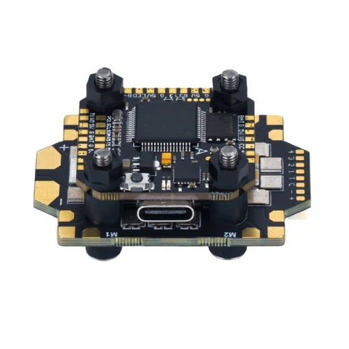 Le contrôleur de vol de la stack est reconnu pour son traitement rapide des données et sa réactivité accrue. Il est équipé d’un processeur STM32F722RET6, d’un gyroscope MPU6000, d’une Blackbox de 16 Mo, d’un BEC (5V 3A) et de 5 UARTS. L’ESC 4en1, de son côté, délivre un courant continu de 55A avec un pic de courant de 65A. Il évolue sous le firmware BLHeli_32, prend en charge le protocole Dshot 600 et possède une fréquence PWM de 24-96 kHz.