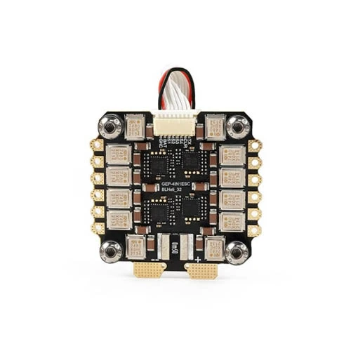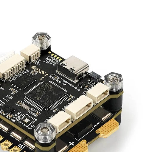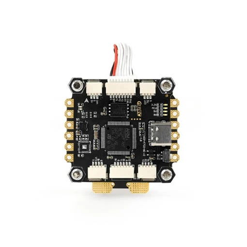 La FC de cette stack est équipée d’un processeur STM32F722, d’un gyroscope ICM42688-P (SPI), d’une Blackbox de 16Mo, de deux BECs (5V 3A, 9V 2.5A) et de 5 UARTs. L’ESC, quant à lui, évolue sous le firmware BLHeli_32. Il peut supporter un courant continu de 70A avec un pic de courant de 80A pendant environ 5 secondes. Il prend en charge les protocoles Dshot 150/300/600.