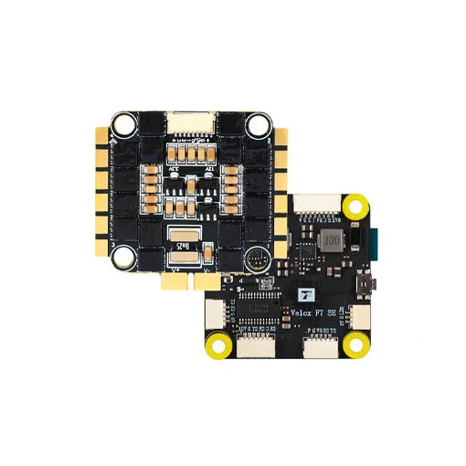 La stack T-Motor Velox F7 SE V50A allie puissance, précision et fiabilité pour une expérience de vol unique. Cette stack T-Motor est composée d’un contrôleur de vol F722 SE et d’un ESC 4en1 V50A SE HD. La carte de vol est dotée d’un processeur STM32F722, d’un gyroscope ICM-42688-P, d’un firmware STM32F7X2, d’un double BEC de 5 V (2 A) et 10 V (1,5 A), d’une Blackbox de 128 Mb, d’un OSD AT7456E et de 6 UARTS. Cette FC intègre de plus le Bluetooth TMFC. Vous pourrez ainsi régler vos paramètres depuis l’application SpeedyBee. Cette carte de vol comprend aussi le PIT mode, vous permettant de régler votre VTx sans perturber les autres télépilotes en plein vol.